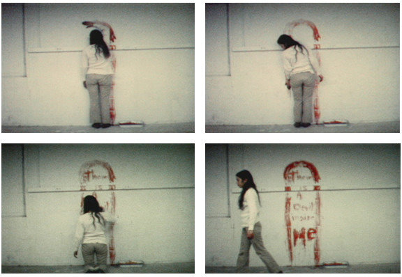 This series of photographs is from a video of Ana using blood to paint out, “there is a devil inside me”. At first glance this seems like something out of a horror movie. My first interpretation of this piece was that there was a darkness in her and she can’t fight it. Upon reading up on it, I found that it means much more than that. Since Mendieta was Cuban she was often seen as an “erotic being”, aggressive and sort of evil. She uses the blood as a motif for the expurgation of impurity. I think this video art represents themes of violence as well as the theme of place and belonging. She is living in a place where she is seen as something she is not and by writing “there is a devil in side me” she is purging herself of that negativity by exploiting it in art for everyone to see.