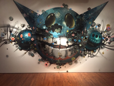 These are the two pieces I chose to analyze. Both of these pieces take up an entire wall. Jeff soto’s piece “The Stars at Night” invite us into his imagination. In my opinion his version of stars are like a monstrous daydream but it still alludes to our real world. This piece uses bold colors and he alters the light and the color giving it a dreamy feel. This piece is also two dimensional. The three circles jut forward out of the wall slightly, with everything else painted on. I noticed he sticks to using circle shapes and many colors that we would associate with space. Low Bros “Tic Tac Toe” piece is strictly spray painted onto the museum wall. It sticks to the shades of red black and white, the only differing color being the blue. This piece is interesting because it is painted 3 dimensional, like the room extends further back and you can walk right into the painting. To me this painting looks like two dogs fighting over the world, but actually represents how we are constantly at war over the world, a place we all have to live. The use of square and sharp shapes bring out the seriousness of this piece.